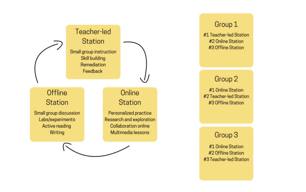 Profesorul începe ora explicând ce se va întâmpla în fiecare din cele două stații, apoi pune jumătate din clasă (fie pe cei prezenți în clasă, fie grupul de elevi de acasă) să înceapă lucrul în Stația #2. Apoi profesorul ia restul clasei în Stația #1 pentru jumătate din timpul orei, înainte de a schimba și a trece cealaltă jumătate a clasei prin Stația #1.