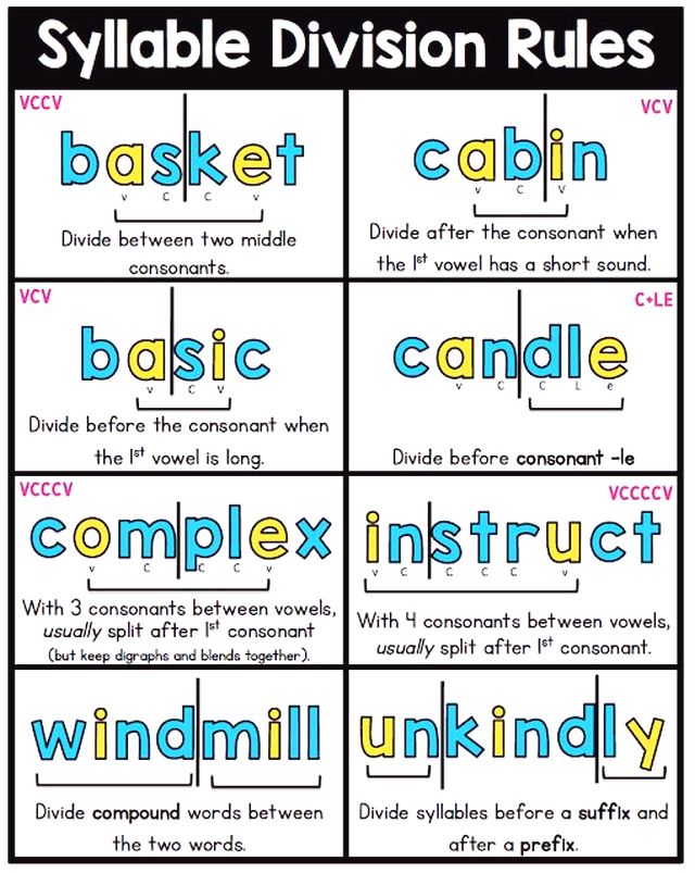 - Din clasa 1-a până la clasa a 3-a, elevii sunt învățați cele patru diviziuni majore ale silabelor (din limba engleză): VCCV, VCV, VCCCV, și VV.