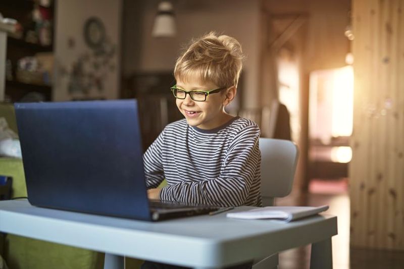 Elev din clasele elementare discutând online cu colegii