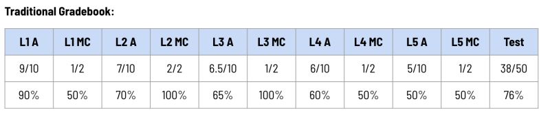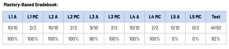 Ia ca exemplu un capitol, cu 5 lecții și o evaluare sumativă. Să presupunem că fiecare lecție are asociată o temă (notată cu de la 1 la 10 puncte), o evaluare de măiestrie (MC – notată cu până la 2 puncte), iar evaluarea sumativă se face cu un test (de maxim 50 de puncte). Într-o abordare tradițională cu ritm fix unde elevii nu sunt notați pe baza măiestriei, un elev ar putea lua următoarele note: