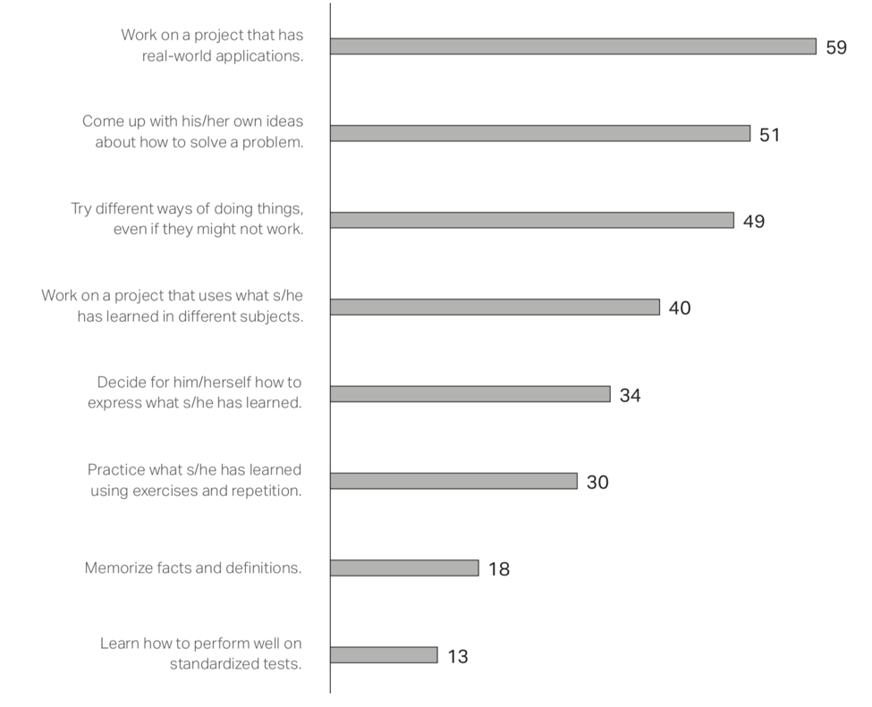 Aruncați o privire la acest grafic din raport, care arată modul în care experiențele de învățare au fost clasificate, cu procentul de părinți care spun că PBL este “foarte important.”