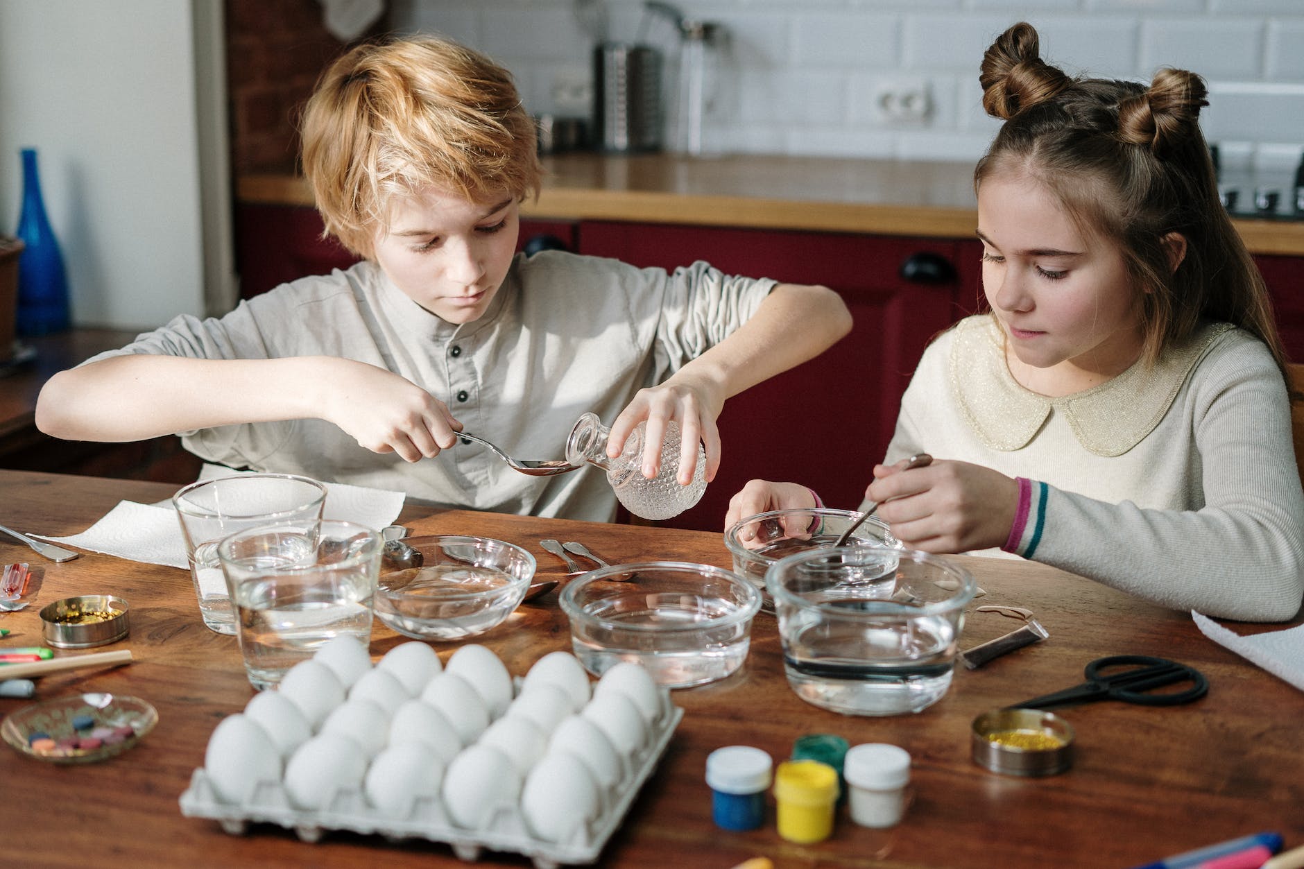 1. Puneți câte un ou în fiecare pahar. Se toarnă suficient oțet pentru a acoperi fiecare ou. În jurul oului vor începe să se formeze bule și acesta va pluti în sus. Pentru a-l menține scufundat, pune un cuțit de unt în pahar pentru a-l ține apăsat.